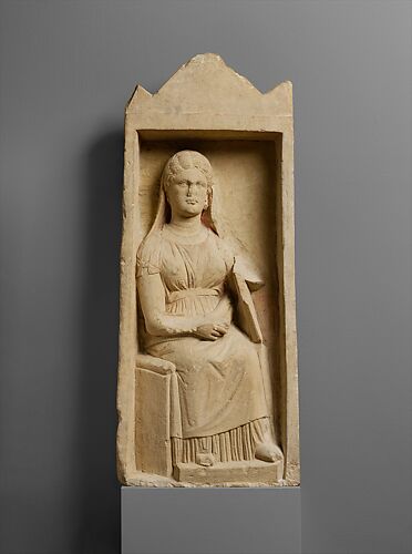 The influence of Greek grave monuments can be seen in this relief of a seated woman with her right hand raised to lift her himation (cloak) over her head, as though preparing for departure. Greek artists, however, rarely showed such figures in a frontal position.