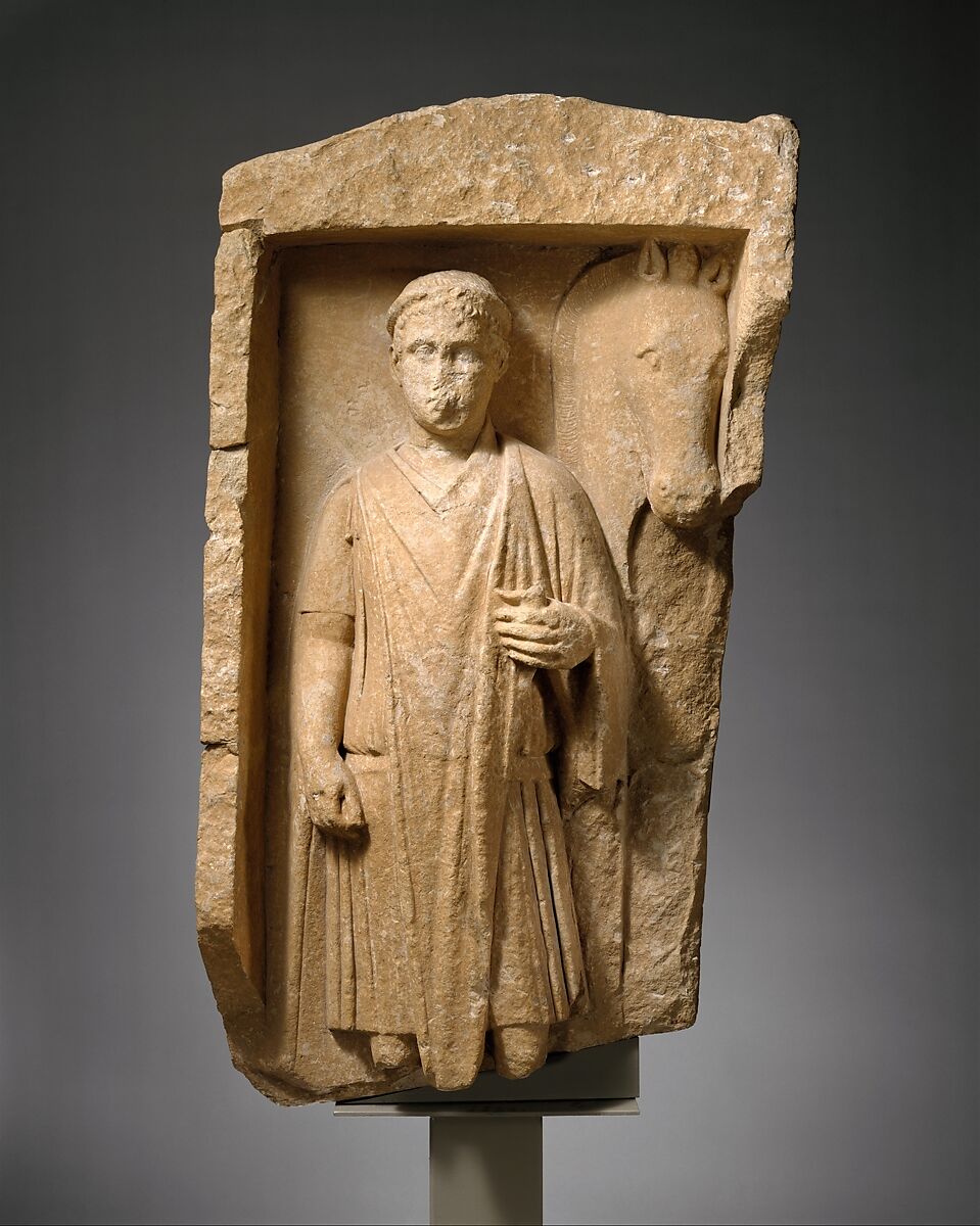 The architectural frame and the frontal pose of the youth are typical of a small group of grave monuments found on Cyprus that probably date to the early years of the Roman Empire.