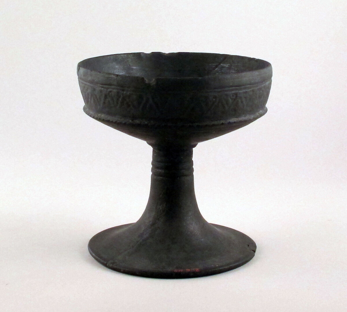 Shallow cup on high foot, with stamped decoration of scrolls and lotus buds.