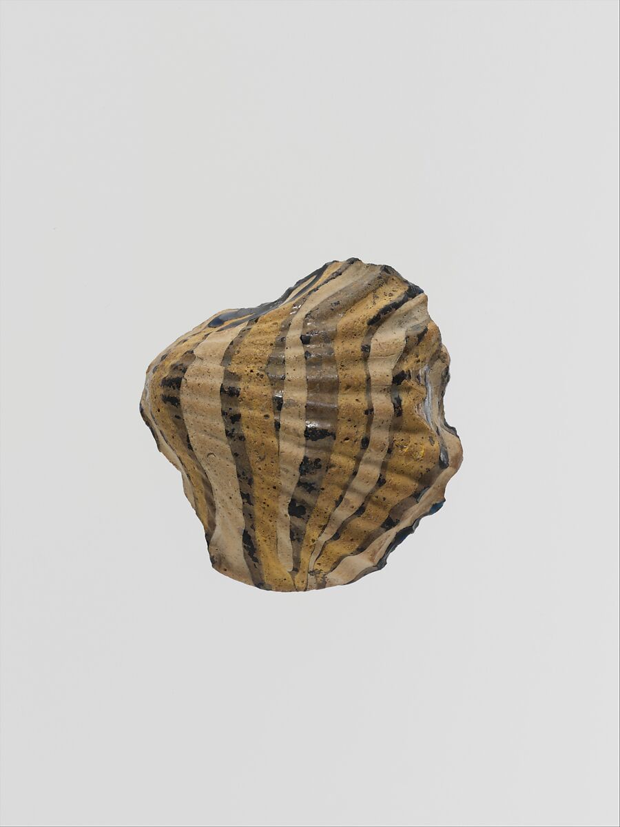 Solid block with flat underside in the shape of a bivalve mollusc with radiating ribs.