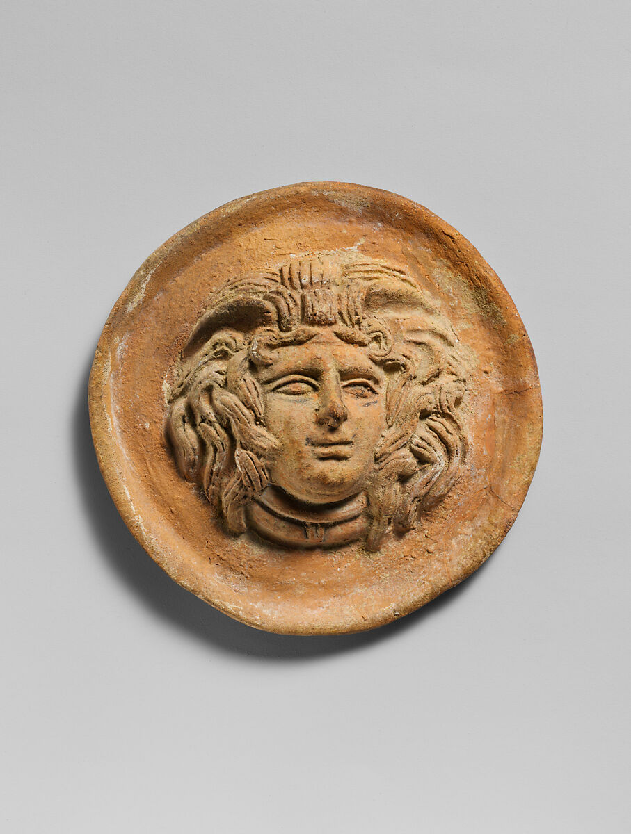 The central decoration on this roundel is a gorgoneion, the head of Medusa. She is depicted as a beautiful female with wavy locks of thick hair, a sharp change from the monstrous Gorgon of earlier periods. The small wings above her forehead identify her as the Gorgon sister. Traces of pink and blue paint are preserved. Medusa remained a popular ornamental element through the Greek and Roman periods; this roundel may have decorated a piece of furniture or a wall.
