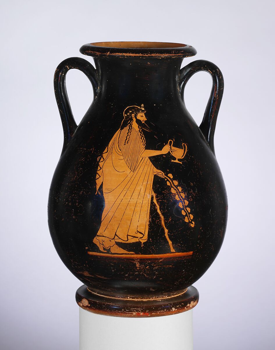 The figures have been accommodated admirably to the size and shape of the pelike. Dionysos is dressed up, including soft shoes. The bending branch and the end of his staff beneath the kantharos evoke flowing wine. His satyr attendant is characterized by his nudity and by the wineskin that levitates behind him. He extends his oinochoe (jug) to his master's kantharos (drinking cup).