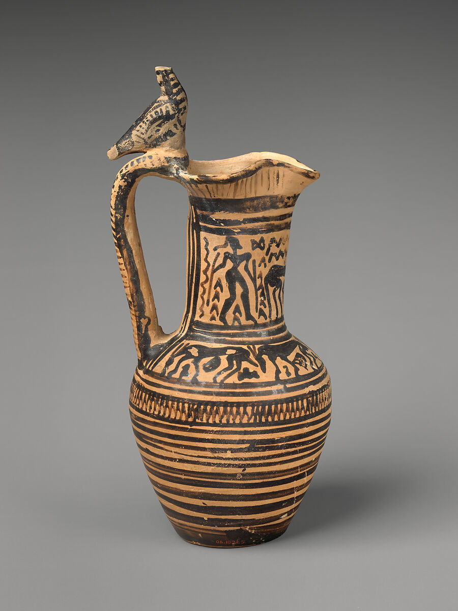 The neck shows a man with two horses; a file of mules grazes in the panel on the shoulder; a bird perches on top of the handle.