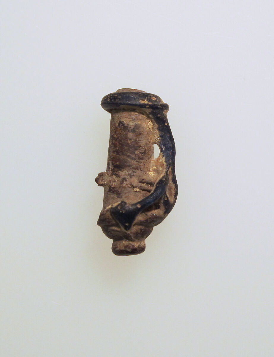 Uncertain color, streaked with red; handle and trails in translucent cobalt blue. Tall cylindrical body; rounded lip with applied trail as rim; rounded towards bottom; small pad base; vertical handle extending from lower side of body to underside of rim. In addition to the applied trails forming the rim and handle, there are two horizontal trails around the lower half of the body. Body intact, but parts of trails missing with weathered edges; dulling and thick creamy weathering.