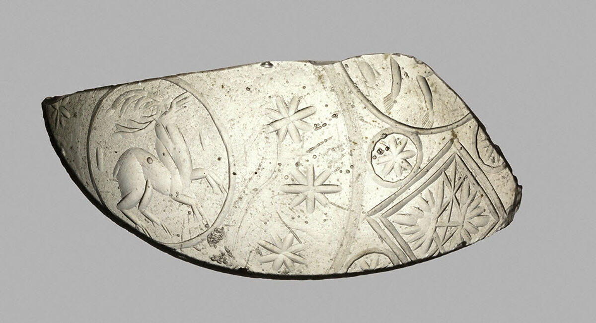 Finely-engraved decoration comprises at least three bands, separated by two, probably horizontal grooves: on bottom, a circular medallion with an antlered stag facing right, flanked to either side by short, vertical cuts; a band with eight-rayed stars [or rosettes] (of which parts of four survive), enclosed in a continuous wavy line; the outer band on the upper side of the body is more elaborate comprising part of a circular medallion with the forelegs of an animal and, to its right, a lozenge filled with a geometric pattern (including stylized palmettes) and flanked between the corners with smaller circular medallions each containing an eight-rayed star.