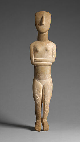 Male figures are rare in Cycladic art. Even less common are examples like this one that exhibit both male and female features. The carved hair (usually painted on female statuettes) and pronounced genitalia are characteristically male, but the artist followed the same overall form used for contemporary female representations, including the clearly defined breasts. Figures of ambiguous gender are found in Aegean sculpture as early as the fifth millennium bce, but their meaning is unknown.