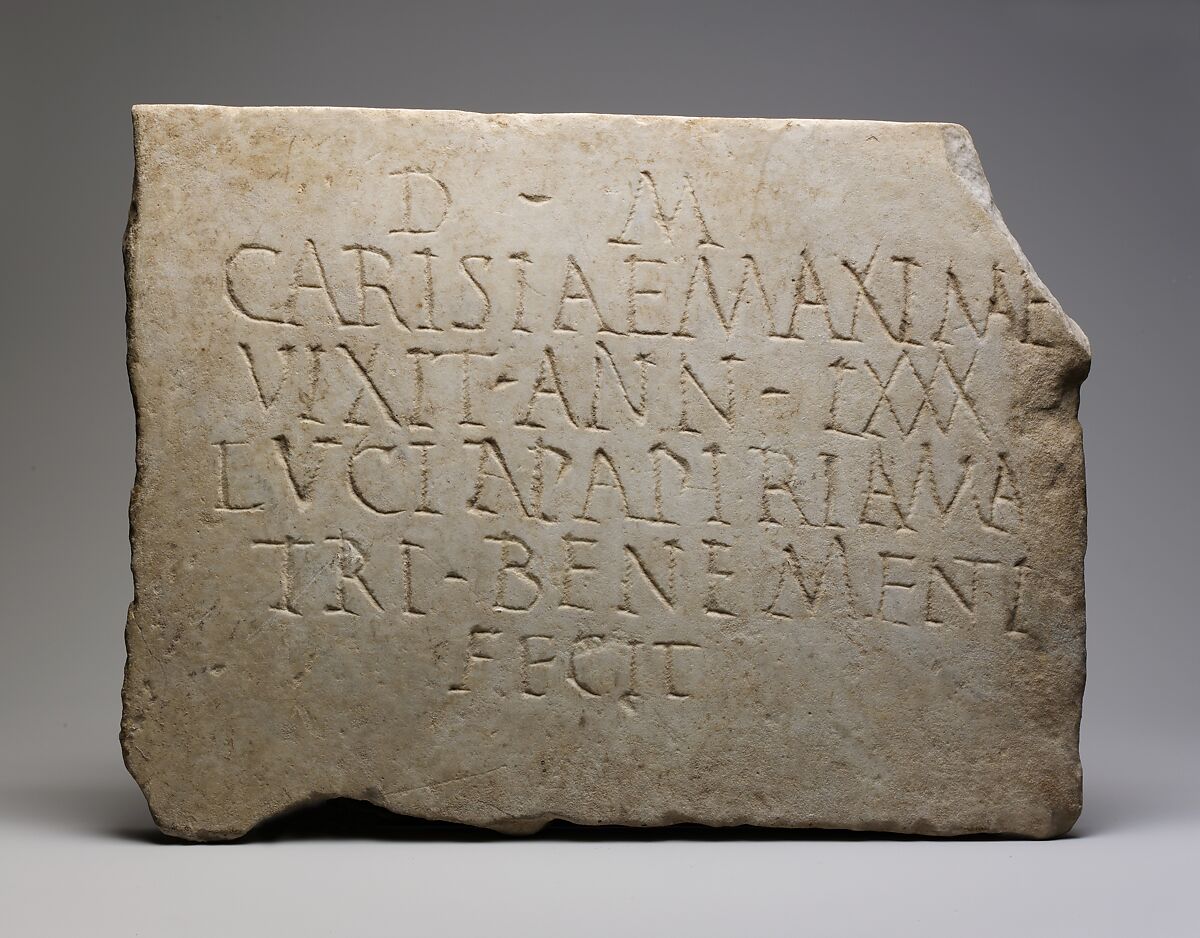 The Latin inscription records that the plaque was set up by Lucia Papiria for her mother Carisia Maxima who died aged eighty.