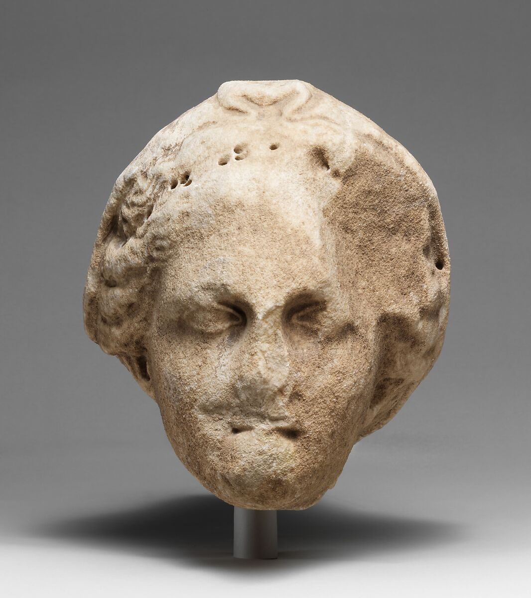 Despite its worn condition, this head radiates with the serenity and power of Late Classical art. The series of holes drilled in the hair probably held a metal diadem or wreath. The goddess Demeter may be represented.