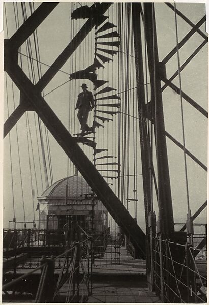 Head of the Bauhaus typography and advertising workshop, Herbert Bayer took up the camera about 1925, initially using photography in relation to his design work and later pursuing it for its own sake. In 1928 he traveled to Marseilles, where he photographed the Pont Transbordeur, a steel bridge with a moving "transporter" platform between its two towers that was celebrated, like the Eiffel Tower, as an icon of modern construction. As were a number of other avant-garde photographers, including his Bauhaus colleagues Moholy-Nagy and Florence Henri, Bayer was fascinated by the novel spatial relations of the bridge's crisscrossing steel girders and open spiral staircase.