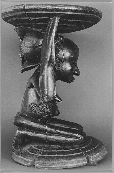 An example of a carved caryatid, this kneeling female figure attributed to the Buli Master Ngongo ya Chintu holds up part of the wooden stool. Framed above and below by two coil-like circular disks, the stool functions not as a seat but as a vessel for the spirit of a Luba or Hemba chief. The profile view and lighting enhance the figure’s face, her arranged hair, and the pattern on her midsection. Her disproportionally large hands, central to her role as caryatid, are de-emphasized within the photograph, placing the focus on the figure as opposed to her supporting role within the stool’s structure. The photograph’s title comes from the original catalogue for the Museum of Modern Art’s 1935 exhibition African Negro Art, which was one of the first shows in the United States to display African sculptures as works of art instead of ethnographic objects. Once the show was installed, Evans was commissioned by the museum to photograph the sculptures on view.