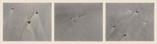 The landscape is one of Callahan's central themes in a remarkably diverse career in photography that includes portraiture, architecture, and street photography. Here, studying the Chicago beach as if it were a Zen garden, Callahan focuses on the delicate surf line, two or three stones, and the cone-shaped interference patterns created by water returning back to the lake. The elegant simplicity and planarity of the photographs (representative of Callahan's earliest work) suggests a reading of the subtle rhythms that develop in the intervals between the pictures. The work evokes a sense of quiet contemplation, formal perfection, and perhaps even material transcendence.