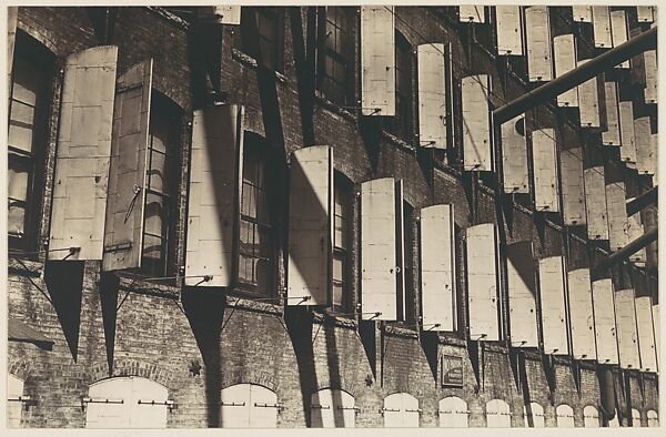 In the spring of 1931, Evans joined the cultural impresario Lincoln Kirstein and the architecture critic John Brooks Wheelwright on a project to document Victorian houses in Massachusetts. During their campaign, they hit upon the idea of also photographing nineteenth-century factory buildings alongside domestic architecture. This approach produced a more balanced vision of the typical American city. In this close-cropped view, the syncopated visual rhythm created by the shuttered windows presents a dynamic counterpart to the decorative patterns inherent in Victorian architecture.