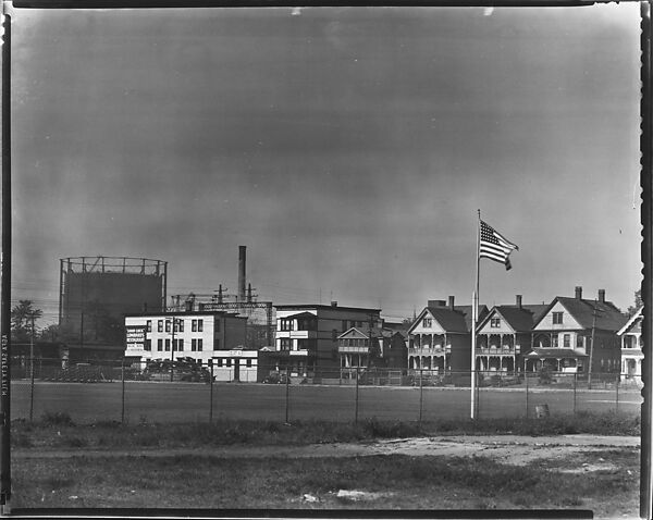 - Title: [Houses and Oil Refinery Across Baseball Field with Flag in Foreground, Bridgeport, Connecticut]