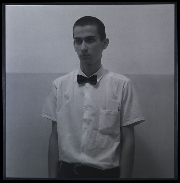 Since the late 1970s Faigenbaum's work has evolved from intimate portraiture to more enigmatic meditations on the role of the individual amid the depthless intricacies of history, social structure, and spiritual experience. This lifesize image suggests that the artist and his subject have turned still more elusively inward. The hermetic simplicity of this gentle young waiter in a Prague beer hall impels the kind of deep empathetic engagement one feels for a Giacometti figure or a nameless Kafka protagonist. His gaze suggests a range of attentive attitudes (abstracted or vacant, dreaming or watching tables), while the horizontal division of the wall behind him might just as easily be read as an empty landscape and his isolation as that of a monumental statue.