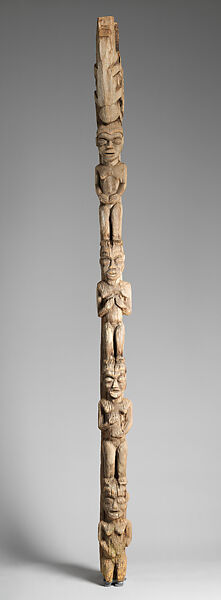 Across the Grassfields, sovereigns’ chambers are designed for both privacy and safety. They have multiple thresholds so the fon (ruler) may circulate undetected. This pillar was carved to support the main portal to the fon’s quarters at Kedjom Keku (Big Babanki). Topped by a worn representation of what was likely a leopard, it is composed of four female figures, each grasping her rounded abdomen. The bottom figure kneels in a posture of supplication that may also suggest childbirth. Following a 1933 palace renovation, this work was relocated to the reception hall and displayed alongside architectural highlights from elsewhere in the compound.