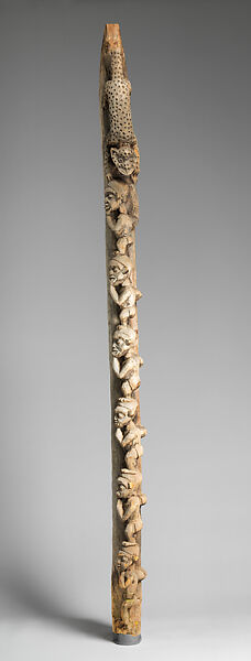 This pillar featured within an intricate network of jambs, posts, and beams that once composed a Grassfields palace. It is carved with depictions of leopards, potent symbols of sovereignty throughout the Grassfields. There the fon (ruler) holds sole claim to the pelt of any leopard hunted within his domain. As palaces are made from woven bamboo and other vulnerable organic materials, they require regular renewal. During a 1933 renovation of royal complex at Kedjom Keku (Big Babanki), this and two other related works were acquired by German American missionary Paul Gebauer and his wife, Clara.