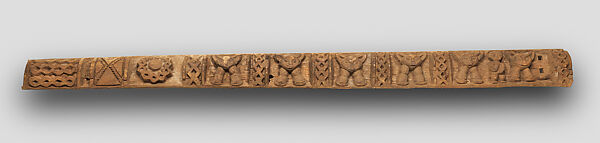 This lintel featured within an intricate network of jambs, posts, and beams that once composed a Grassfields palace. It is carved with depictions of leopards, potent symbols of sovereignty throughout the Grassfields. There the fon (ruler) holds sole claim to the pelt of any leopard hunted within his domain. As palaces are made from woven bamboo and other vulnerable organic materials, they require regular renewal. During a 1933 renovation of royal complex at Kedjom Keku (Big Babanki), this and two other related works were acquired by German American missionary Paul Gebauer and his wife, Clara.