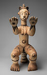 Anjenu river spirits are characterized as dream haunters and the source of infertility and ill-health in Idoma society. In an effort to appease them, women offer bottles of river water and calabash gourds at dedicated shrines. The priestess responsible for a given site of veneration may also incur the cost of commissioning a work such as this one, its arms raised in a gesture of praise. Culturally hybrid, anjenu figures combine aspects of Igala and Hausa nature spirits with those of the pan-African water deity Mami Wata.