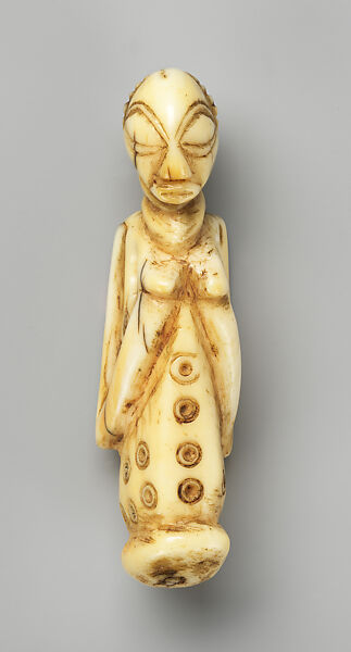 Pendants were made by professional sculptors out of elephant ivory, bone, or horn. While its texture and resistance to cracking made elephant ivory the material of choice, the thighbones of hippopotamuses allowed artists to achieve comparable effects. Bodily contact through wear altered the whiteness of the pendants. Although this effect is prized by Western collectors, the Luba owners of such prized possessions would scrub the surface daily with water and abrasive sand to maintain a pristine, bone-white aesthetic. That treatment also blurred the features over time. Usually made without legs, pendants often showed women holding their breasts, a sign of nurturing, respect, and—according to some Luba spokespersons—royal secrets (Roberts and Roberts, 1996, p. 109). The coiffure portrays a fashionable Luba hairstyle, while the circular marks and dots represent scarification. The Luba admired the raised markings on women’s bodies, deemed them erotic, and saw them as a sign of a young woman’s readiness for marriage.