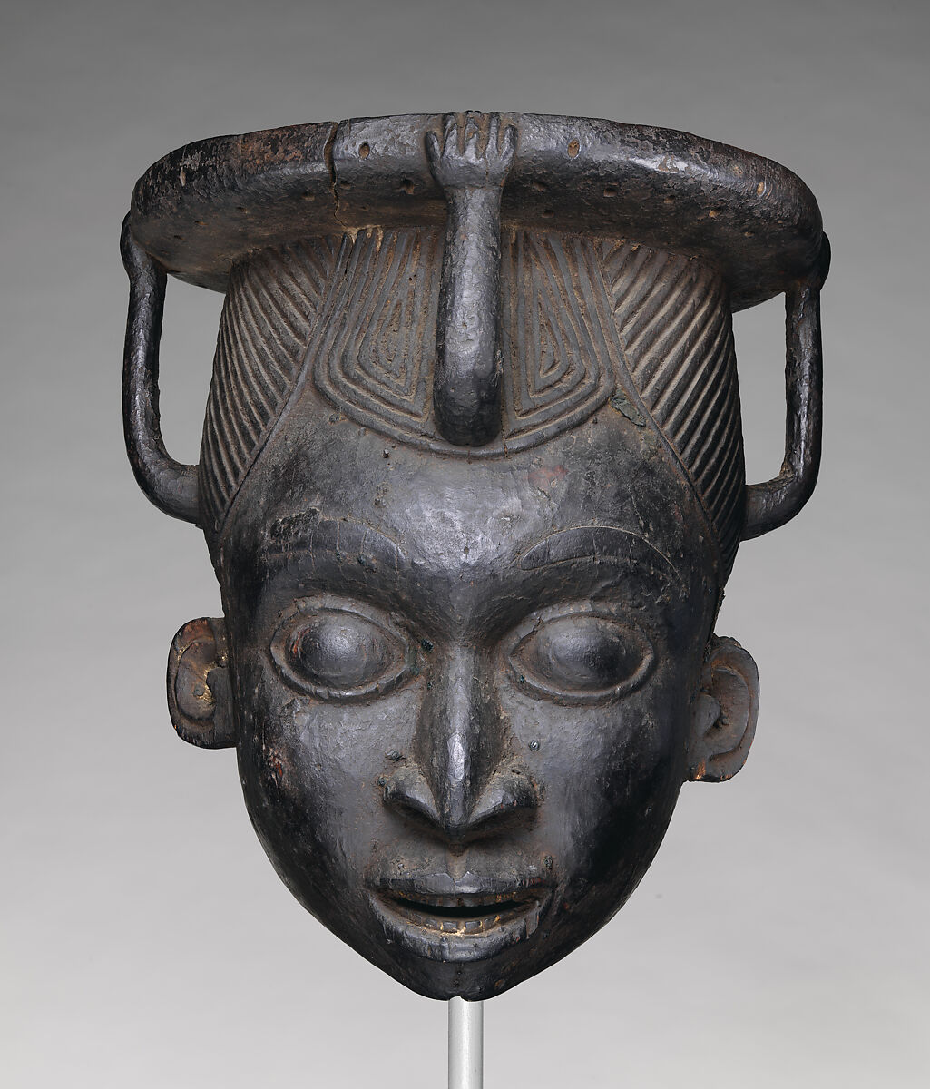 With its name translating to "assistant to the fon" or "father of the country," the Kwifon regulatory society serves as a counterbalance to the authority of the supreme ruler. Its independent lodges settle disputes, administer justice, and act as a stabilizing force during moments of transition. Kwifon’s masks are among the most feared and beloved in the northwestern Grassfields. Their demeanor ranges from menacing to jovial, with individual masks sometimes exhibiting both "hot" (angry) and "cool" (placid) traits. During festivals that ensure the protection of the land and its people, they are accompanied by an orchestra of iron bells and other sacred instruments. Given the popularity of the masks, Kwifon sometimes licenses their replication to local lineage groups. Isolated from their performance contexts and stripped of their costumes, the glossy, iron-blackened dance crests become difficult to identify.