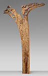The Sentani people of northwest New Guinea live in villages built over the waters of Lake Sentani, a large inland lake. Sentani houses are constructed on wood pilings and are linked by raised boardwalks, allowing the residents to walk around the village. Until the early 1920s, the most imposing structures in most Sentani villages were the houses of the hereditary chiefs. These houses were lavishly decorated with architectural carvings on the pilings that supported the roof and floor.The carvings were of two basic types: tall Y-shaped posts, such as the present work, which supported the central roof beam, and human images carved atop the pilings that supported the floor. Like all Sentani roof supports, this work is made from a single inverted tree. Originally, the upper trunk was sunk into the lake bed, while the flaring roots formed the wing-like projections at the top, at whose junction the roof beam rested. Beyond structural considerations, the inversion of the tree may refer to the cosmic tree in Sentani religion, which grew downward from the heavens to the earth. The shaft is adorned with S-shaped spirals, possibly representing clouds hovering between the earth and sky. The openwork wings incorporate stylized lizards, which crawl inward toward the trunk.