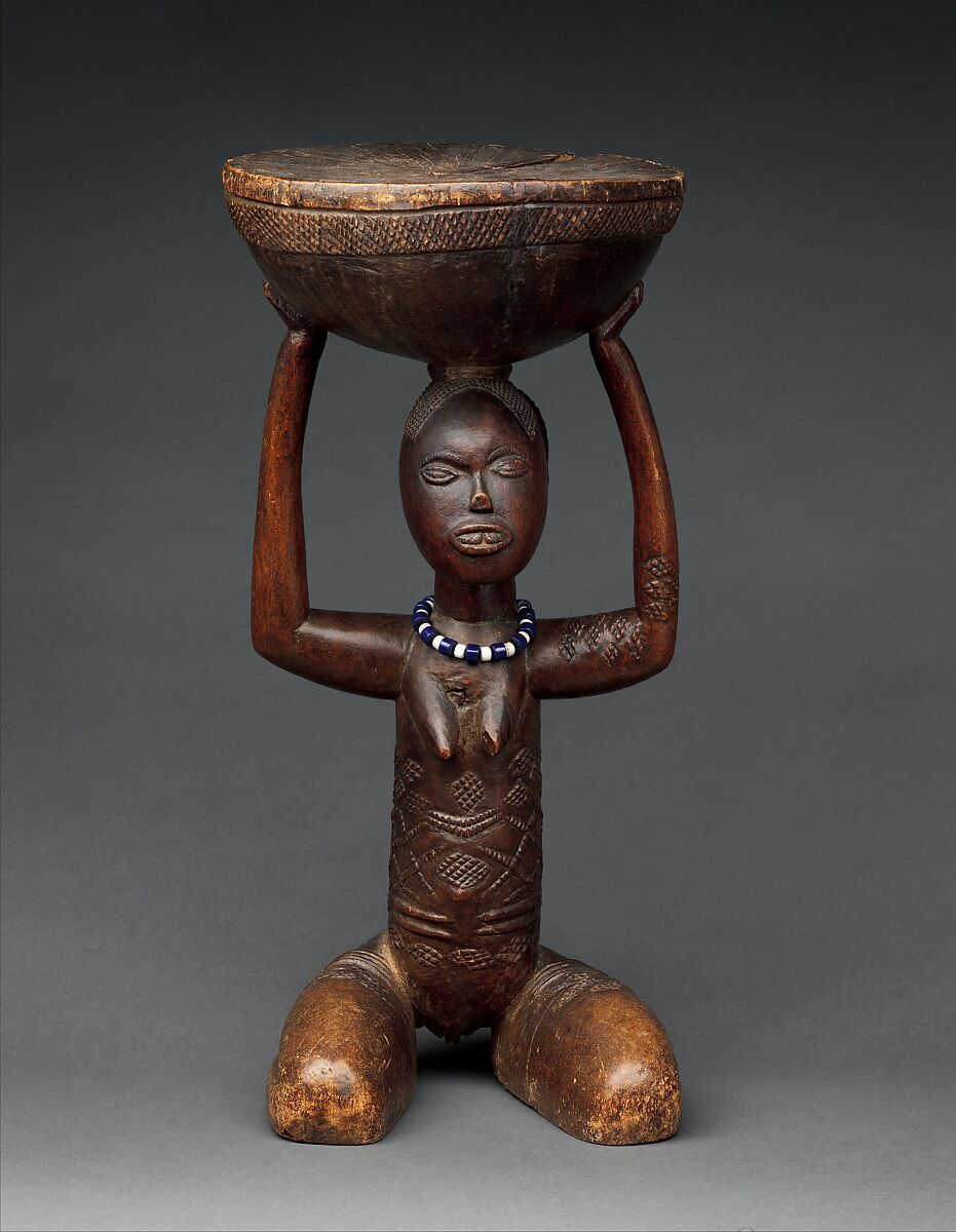 Despite their functional form, royal stools are never used for sitting but, rather, are sacred insignia preserved within a king's palace. They serve as metaphorical, not literal, seats of kingship. The design of Luba seats of leadership may either be abstract or figurative. Those incorporating female caryatids give expression to the Luba conception of the female body as a spiritual receptacle that supports divine kingship. The aesthetic refinement of the female body through elaborate skin ornamentation and coiffure serves as a metaphor for the civilization and refinement that Luba rulers disseminate within society. This particular caryatid displays filed teeth, a practice of beautification thought to render spoken language more "sweet" by weaving words and sentences into utterances of admirable clarity and beauty.