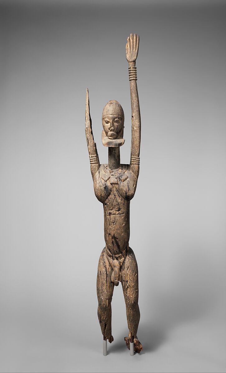 The most distinctive subject rendered by Dogon sculptures is that of a single figure standing with raised arms. This posture has usually been interpreted as a gesture of prayer—an effort to link earth and heavens—and it has been suggested that it may represent an appeal for rain. This masterpiece of Dogon figurative art depicts a man with a well-modeled body in a naturalistic stance. The artist has carefully rendered the figure's musculature, anatomical detail, and body ornament. His stylized beard identifies him as an elder and an individual whose age and experience entitle him to participate in the most important religious, political, and social affairs of Dogon society. The figure wears wristlets, armlets, and anklets that indicate his status, as well as a belt and neck pendants resembling leather talismans that also suggest his spiritual importance.