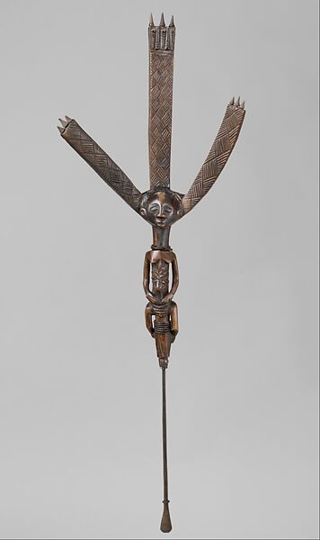 Female imagery is prominently integrated into insignia of Luba leadership. In Luba culture, women's bodies are conceived as receptacles for the spiritual power that protects and upholds the tenets of divine kingship. In this example, a female figure is represented as the shaft. Her extensively embellished skin and elaborate coiffure are those of a cultivated and highly respected member of society and embody an ideal of Luba civilization.