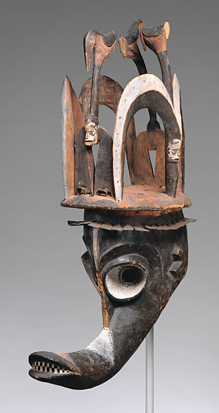 Only the strongest members of an Igbo community’s middle-age grade, composed of thirty- to fifty-year-old men, were eligible to wear this epic form of expression. In contrast to the gentle maiden spirit mask, also performed by this cohort, the forceful Mgbedike is propelled by a heavy gait. This tribute to cosmic bravery appears at secondary burials for prominent community members or during processions from village to village to challenge rival masks. Its aggressive comportment involves lunging at onlookers and dispersing crowds by brandishing a knife. Each unique headpiece has a name reflecting its highly individualized character. Here, an expansive openwork crown of avian and maiden mask forms rests above a pinched snout that terminates in a checkerboard of bared teeth.
