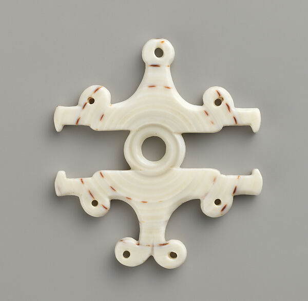 There are parallels between the adornment of human bodies and that of canoes in Solomon Islands. The mirrored frigate bird design seen here is also often replicated in canoe prow adornment in New Georgia. Pendants such as this are sometimes tied to the prows of canoes to increase the speed of the vessels and to ensure their safe passage on the ocean. Both the human body and canoes are seen as vessels capable of harnessing ancestral power when properly adorned.