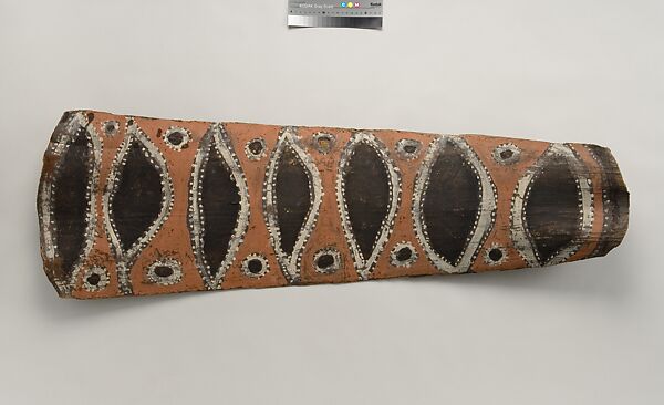 This panel is one of over 270 original paintings commissioned from Kwoma artists in the village of Mariwai in 1970 and 1973 by Douglas Newton, the first curator of Oceanic art in the Department of the Arts of Africa, Oceania and the Americas. Once completed, they were shipped to New York and installed in the galleries. In 2007, when the Oceania galleries at the Metropolitan Museum were renovated, the panels were attached to a new superstructure. Although less steeply pitched than the Kwoma houses found in villages today, the installation evokes the essential form of a ceremonial house ceiling. Together these suspended panels form an impressive and spectacular installation in the Metropolitan Museum which, at 80.4 feet (24.5 meters) end-to-end, is the largest contemporary art installation in the museum.