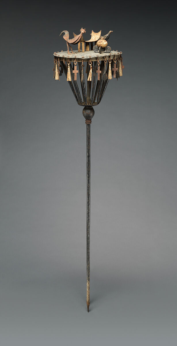 The tableau featured at the summit of this asen blends visual and verbal references to the life of a departed family member. An asen’s success was measured by its author’s mastery of both the Fon language and metalworking. The forms that compose this praise poem relate to philosophical thought and spiritual practices. A curved seat indicates that the person may have been a chief or priest. A rooster and a chicken, animals commonly sacrificed in honor of the ancestors, evoke an ideal balance of male and female attributes and the beginning and end of each day. The prominent calabash gourd, used as a receptable during asen-related rites that honor and care for the deceased, represents a schema of cosmic unity. The four spirals forming the calabash’s base reference the four corners of the universe, the cyclical nature of life and death, and the snake deity Dangbe Ayido Hwedo. Togbe (pendants) in the form of crucifixes reflect exchanges with the Christian world and local devotional practices.