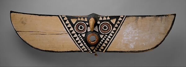 Bwa masquerades draw upon the stylized features of humans, animals, and even insects. This mask is called duho, which means hawk (or sometimes duba, meaning vulture). The wings of the primarily two-dimensional hawk mask are usually simply decorated with white paint. The face of the hawk has been reduced to basic geometric forms. An inverted triangle defines the "face" and contains a protuberant, conical mouth and two sets of concentric circles for eyes. The outwardly projecting beak and the hook at the top of the face are two of the few elements that serve as a contrast to the overall planar nature of this nature spirit representation. Bold geometric shapes repeated in brightly painted designs are often added to enliven the surfaces of these relatively abstract forms. Bwa nature spirit masks are particularly impressive due to their commanding size and shape. This hawk mask's horizontal span extends nearly five feet wide; the wingspan of a related representation of the butterfly (yehoti) may be up to six or seven feet. Despite their daunting scale, these face masks are indeed worn by a performer, who bites on a thick fiber rope that passes through holes in the mask to secure it to his face. The mask is also attached to a fiber costume that covers the head and body of the performer. The choreography of the performance is derived from the movements and behavior of a hawk or vulture.