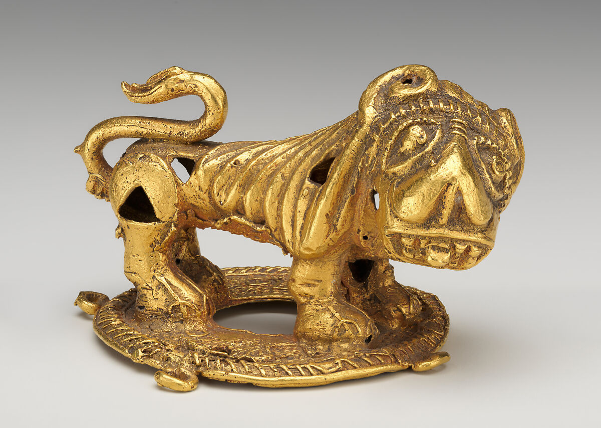 One of a pair (along with 1979.296.228), this commanding gold ornament of a lion was a symbol of Akan royal power. The animal’s head is oversized in comparison to the rest of its body, and turns to the side to regard the viewer. Filled by large circular pupils, the oval-shaped eyes tilt downwards on the diagonal. The mouth opens in a wide half circle to reveal the tongue poking through the pointed incisor teeth. The stout torso tapers from the head to the hips, where it joins well-muscled back legs supported by large paws. The s-shaped tail curves back on itself to rest on the lower back; the hairs of its tufted end are indicated with soft vertical depressions. The ornament is hollow, and contains several triangular cutouts on the flanks, torso, and legs; these allowed the ornament to be both lightweight, and for the artist to conserve the precious medium of yellow gold. The lion stands on a ring-shaped base edged with a flattened rope border: this textured detail, as well as the twisting outlines around the eyes and along the hairline may have been created using a filigree or gold-beading technique. A series of four evenly spaced small rings are attached horizontally along the perimeter of the base. This ornament was likely made using the lost wax casting method, in which a model is created in wax, surrounded with a clay investiture that is then baked (allowing the wax to melt out), and then filled with molten metal. As each casting made using this process is unique, there are subtle differences in the bodies, facial features, and openwork areas on each golden animal. These differences are particularly evident in the muzzle: in one example, the tongue is wide and fleshy, and the flattened cheeks curve upwards to form a triangular snub nose with pointy nostrils; in the second example, the tongue is as a narrow rectangular projection, while the rounded triangular nose is framed by the padded lower cheeks. Additionally, one lion faces to the right, while the other faces to the left, suggesting that they were meant to flank another object.