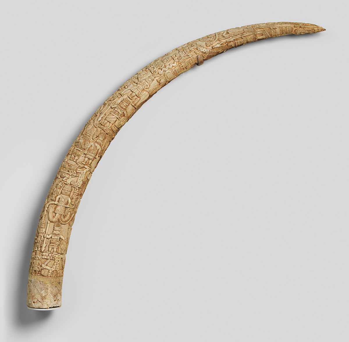 At its origins, the centralized city-state of Benin was founded by Edo-speaking peoples. The accounts by official court historians and descriptions provided by visitors evoke a vibrant cultural center continually redefined by its leadership through shifting internal and external power dynamics. According to oral tradition, circa 1300, Edo chiefs are reputed to have reached out to the leader of neighboring Ife, Oranmiyan, to establish a new divinely sanctioned royal dynasty. Since then, the investiture of Benin’s rulers to the title of obas has conferred upon them at once a role of chief priest officiating in important religious ceremonies and presiding over an elaborate structure of palace officials. During the fifteenth century reign of Oba Ewuare, Benin’s armies were formed and the fortification of its capital with a massive wall undertaken. In parallel, delegations of Portuguese traders assiduously sought to secure exclusive commercial treaties with this leader of the region’s most powerful polity. At its height in 1500, Benin’s authority extended to the Niger delta in the east and to the coastal lagoon of Lagos in the west. Its major exports of pepper, textiles, and ivory were exchanged for copious quantities of imported metals. This access to an influx of brass led to an explosion of creativity by court artists who transformed it into works for the palace ranging from ancestral portraits, positioned on royal altars, to decorative plaques depicting the oba, his courtiers, and foreign interlocutors. From the earliest such exchanges, those Europeans commissioned exquisite ivory artifacts from Edo carvers for princely collections back home.