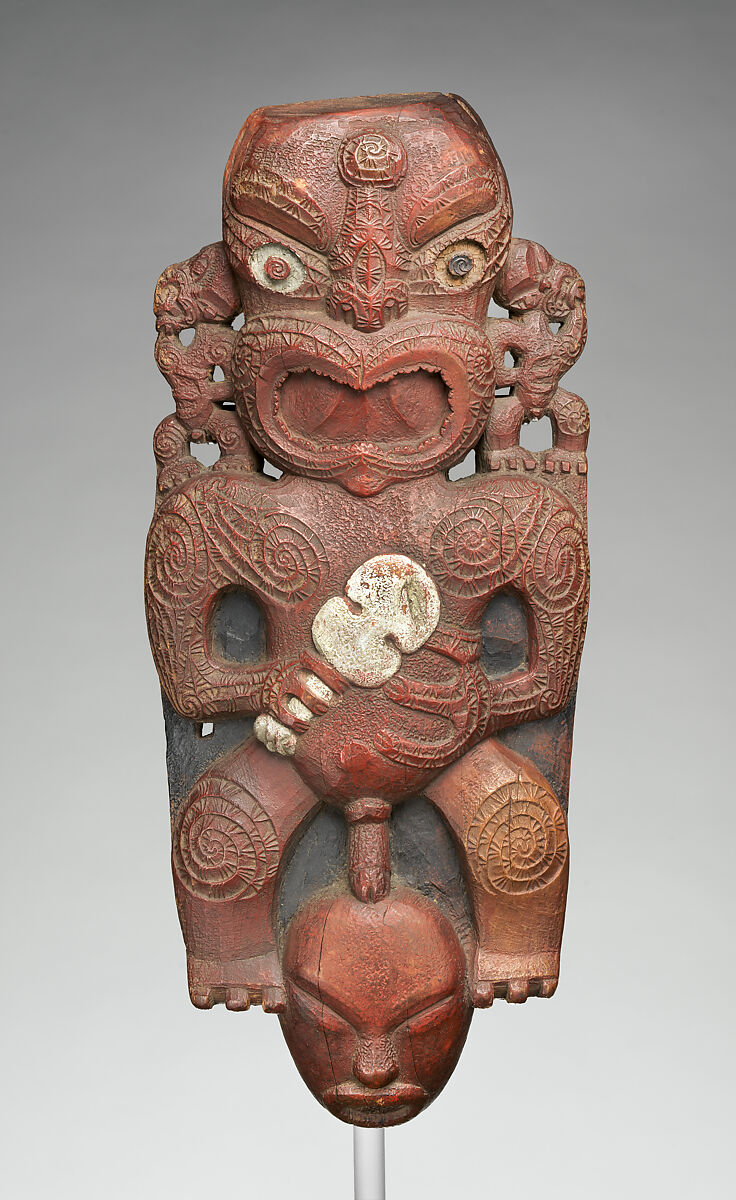 Ancestors (tupuna) play a central role in Maori art and culture. The majority of human images (tiki) in Maori art portray ancestors, and some of the finest ancestor images were, and are, created as architectural ornaments. This imposing tiki is a tekoteko (gable ornament), which once adorned the roof peak of one of the major buildings in a Maori village, likely that of a storehouse (pataka), belonging to the village chief and used to safeguard food, tools, weapons, and other items. Each gable ornament depicts a founding ancestor, the progenitor of the group (iwi) of which the community forms a part. In this image, the ancestor grasps a kotiate (a type of hand club) firmly in his right hand. The kotiate was used in hand-to-hand combat, and its presence suggests that this ancestor was an accomplished warrior. Probably carved in the 1820s, this work, which was collected soon after it was made, still preserves its original polychrome paint.