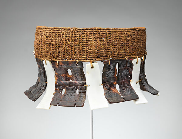 For important occasions, Marquesans wore a variety of headdresses (pa'e). Among the most striking are the pa'e kaha, which consist of a band of woven coconut husk fiber adorned with alternating plaques of carved turtle shell and white shell. Worn primarily by chiefs, warriors, and male dancers, pa'e kaha were owned by families rather than individuals. The turtle-shell plaques were artificially shaped by heating and then bending them into the desired form. They are typically adorned with tiki (human images) and geometric designs in low relief. Early Western illustrations typically show pa'e kaha worn, as here, with the plaques curving downward but it is possible that they were worn with the panels upright, like a crown.