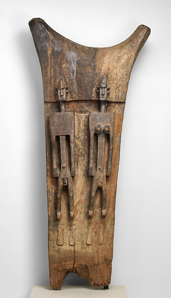 Most of the togu na posts that feature figural imagery are from villages on the Seno Plain, a sandy expanse extending from the Bandiagara’s cliffs to the Malian border with Burkina Faso. The majority of these pillars depict voluptuous female figures with pronounced conical breasts, but others feature animals, masks, and phallic imagery. In this example, two sets of footprints appear at the base of a symmetrical, rectilinear male and female pair. Drawing their imagery from Dogon myth, these footprints have been interpreted as those of Nommo, the living being who first stepped on and laid claim to earth.