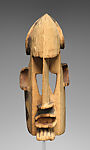 This mask is identified as representing a Samo, a member of a neighboring ethnic group with a reputation for aggressive, warlike behavior. Dogon artists depict many human characters in their masks, such as hogons, binu priests, elders, young people, craft specialists (including smiths, leatherworkers, hunters, and healers), and foreigners, such as Bamana, Fulani, Tuareg, Europeans, and Muslim marabouts. Most of these characters are represented by masks made entirely out of fiber and cloth: only a few human characters are portrayed in wood. While all of these human masks are somewhat similar in form, wooden samana warrior masks are usually distinguished by three long vertical scarification marks on each cheek.