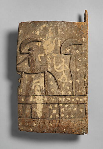 Elaborately carved doors define the threshold of Poro association structures, including training centers and residences situated within sacred groves. The imagery on such portals often depicts the hunt and powerful animals believed to counteract malevolent forces, both of which are features of this example. The raised, curved blade of the figure on horseback is echoed by that of the standing figure at right, creating a processional hunting scene. Painted beneath the equestrian, a crocodile holds some unidentified prey in its jaws. That reptile may refer to wotyon, a symbol of aggression, sorcery, and personal power. The threatening nature of the motifs alludes to the forces harnessed by members of the Poro association, who draw upon animal matter and visual imagery to affect change in the community.