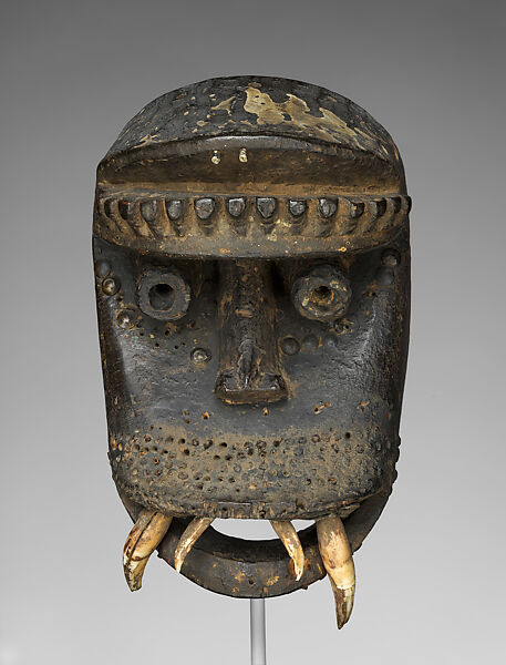 The zone of new tree growth, or bush, that separates farming villages from the deep forest is considered an important point of contact for humans, animals, and spirits. The behavior of animals observed in this liminal space has influenced the masks produced and performed in many Dan communities. Prominent, uneven teeth and a row of antelope horns carved into the mask’s forehead are features associated with Kagle, a troublemaking spirit sometimes identified as a chimpanzee. Kagle performs mischief by throwing sticks at onlookers to warm up a dancing area or by disrupting village festivities with boisterous, erratic movements. As an embodiment of the unruly forces that loom beyond the threshold of the village, Kagle tests the solidity of social institutions and instills appreciation for the value of order.