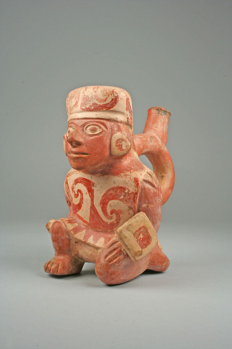 This stirrup-spout vessel, made by a ceramicist of the Moche culture on the North Coast of Peru, depicts a warrior bending down on one knee. The figure wears a headdress that envelopes his hair and extends over the back of his neck. The headdress is decorated with swirls in a pattern that matches his tunic, which he wears over a white loincloth. He wears circular ear ornaments and holds a small rectangular shield in his left hand and a small mace in his right hand. The stirrup-spout vessel—the shape of the spout recalls the stirrup on a horse's saddle—was a much favored form on Peru's northern coast for about 2,500 years. Although the importance and symbolism of this distinctive shape is still puzzling to scholars, it has been suggested that the double-branch/single-spout configuration may have prevented evaporation of liquids, and/or that it was convenient for carrying. The double-branch may have also held symbolic importance, reflecting a belief in the importance of tinku, a Quechua term for convergence, such as the confluence of two rivers. Early in the first millennium AD, the Moche elaborated stirrup-spout bottles into sculptural shapes depicting a wide range of subjects, including human figures, animals, and plants worked with a great deal of naturalism (Donnan, 1992). About 500 years later, bottle chambers became predominantly globular, providing large surfaces for painting complex, often multi-figure scenes.