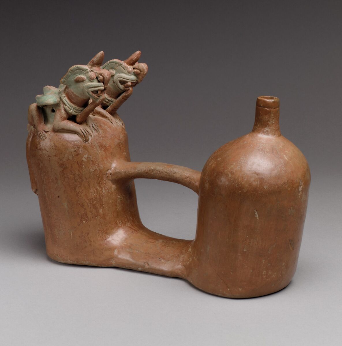Double-chambered bottles were a common vessel form among the Bahía people of coastal Ecuador. The chambers, which were round and squat or tall and slender, as here, were joined at the bottom by a tube and at the top by a strap handle. A single, narrow spout tops one of the chambers, while the other vessel serves as a base for modeled figurative sculptures. On this bottle, two fantastic iguana-like creatures sit side by side at the top, their thick, long tails hanging down the side of the container. The iguanas wear necklaces and head crests; long streamers emerge from their open, fanged mouths; their bodies have dorsal crests and winglike elements projecting on the sides. The dull, bumpy surface of the animals, covered with light green pigment, contrasts with the smooth, burnished finish of the red-slipped chambers. The hollow iguanas function as whistles, their several holes producing a sound when the liquid in the bottle is poured out. Iguanas or dragonlike creatures and serpents are frequent motifs in Bahía art and seem to have played an important role in local mythology.