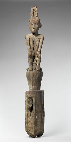 Among the Ngadju/Ot Danum each hampatong is carved for a specific purpose and personifies a particular ancestral spirit or deity. This figure's elaborate headdress and the replication in wood of the highly valued jar suggest that a deceased person of high rank is represented. The spirit of the deceased had to temporarily inhabit the hampatong before it could begin its long and dangerous journey to the next world. In addition to anthropomorphic figures, images of protective creatures such as tigers, bears, and leopards are also carved for the funerals of important persons. This figure's tranquil naturalism distinguishes it from other types of hampatong, which are often characterized by such exaggerated features as bulging eyes or aggressively protruding tongues.