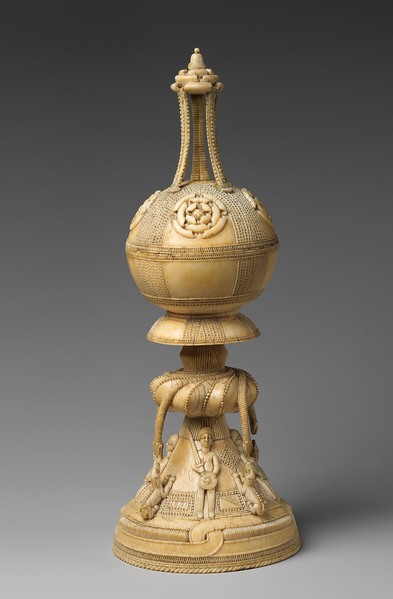 This saltcellar is both an extraordinary example of skilled workmanship and an artifact that epitomizes a singularly important convergence of cultures. In the second half of the fifteenth century, Portuguese explorers and traders were impressed by the considerable talent of ivory carvers along the coast of West Africa. As a result, they were inspired to commission works of this kind for their patrons, which ingeniously combine both European and African aesthetics and forms. During this period, salt and pepper were costly commodities and elaborate receptacles were appropriate for their storage in princely homes.