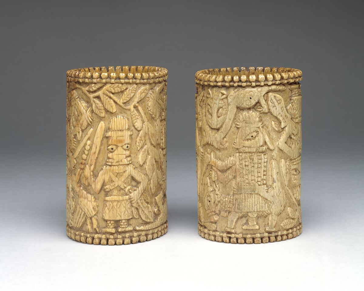 The oba and chiefs of Benin wear pairs of ornate bracelets at palace festivals. Long and cylindrical, these cufflike ornaments may be made of either ivory or brass and display imagery reflecting the exalted status of their bearers. This bracelet is a pair with 1991.17.77.