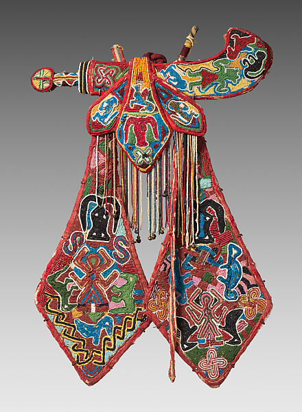 The udamalore sword is made of wood, and both its sheath and the panels are lavishly embroidered with brilliantly colored glass beads. Imported from Europe, the beads are a sign of wealth and status among the Yoruba. Although the beaded figures and animals are arranged symmetrically, their jagged outlines and vivid colors create a dizzying, dancing composition. The motifs--human figures, ram's heads, crouching monkeys, birds, chameleons, and other animals--refer to the protective role of the ancestors, the chief's inalienable powers and privileges, and the mystical forces that protect and strengthen the wearer of such lavish costume ornaments.