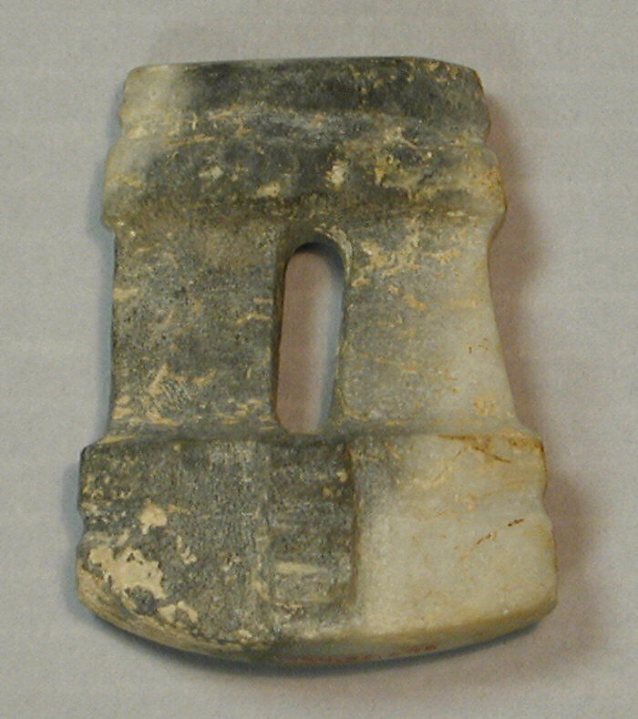 Mezcala models may have served multiple functions over time, in keeping with the Mesoamerican custom of repurposing or re-carving stone objects. Oblong-shaped models (see MMA 1994.35.704), or ones with curved bases (see MMA 1994.35.633), for example, may have been re-carved from celts, ritual tools of great symbolic importance. Several have holes drilled into the base, which could have been used to fasten them with fiber to a larger item such as a ritual bundle, a practice widely known in archaeological and ethnographic contexts in Mesoamerica (see MMA 1994. 35.700). Offerings of Mezcala stone objects in the Templo Mayor, the sacred center of the Aztec capital, Tenochtitlan, built between 1325 and 1519, underscore the importance of these works as a continuation of tradition, as heirlooms, or as emulations of an ancient style.