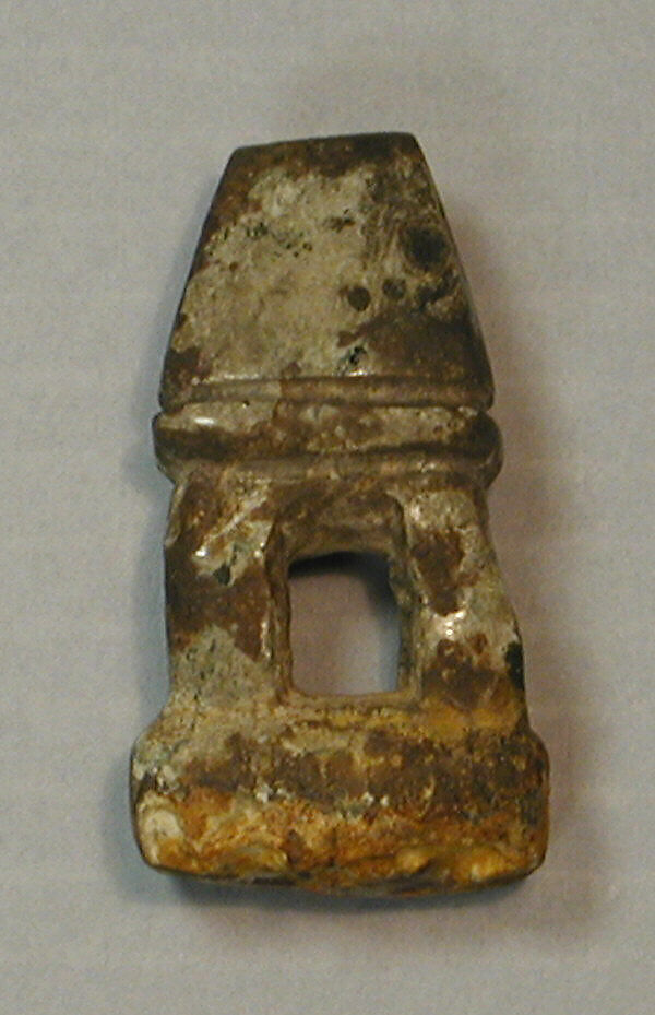 Mezcala models may have served multiple functions over time, in keeping with the Mesoamerican custom of repurposing or re-carving stone objects. Oblong-shaped models (see MMA 1994.35.704), or ones with curved bases (see MMA 1994.35.633), for example, may have been re-carved from celts, ritual tools of great symbolic importance. Several have holes drilled into the base, which could have been used to fasten them with fiber to a larger item such as a ritual bundle, a practice widely known in archaeological and ethnographic contexts in Mesoamerica (see MMA 1994. 35.700). Offerings of Mezcala stone objects in the Templo Mayor, the sacred center of the Aztec capital, Tenochtitlan, built between 1325 and 1519, underscore the importance of these works as a continuation of tradition, as heirlooms, or as emulations of an ancient style.