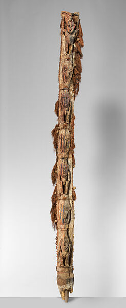 The widespread exchange of ritual paraphernalia such as masks and figures throughout the Lower Sepik region has resulted in a rich cross-fertilization of artistic styles. Indeed, though this housepost was collected in the Ramu River area, the treatment of the human figure and motifs employed suggest the artist came originally from the Murik Lakes or was strongly influenced by Murik techniques and iconography. Art in the Lower Sepik region centers on the representation of important ancestors and spirits. The supporting posts of ceremonial houses, such as the present work, are richly decorated with depictions of the ancestors, spirits, and sacred masks associated with the house. Representations of spirits frequently have long beak-like noses, which evoke the heads of totemic birds, while the noses of human ancestors are more naturalistically rendered. Images of both ancestors and spirits as well as depictions of sacred masks can be seen on this housepost.